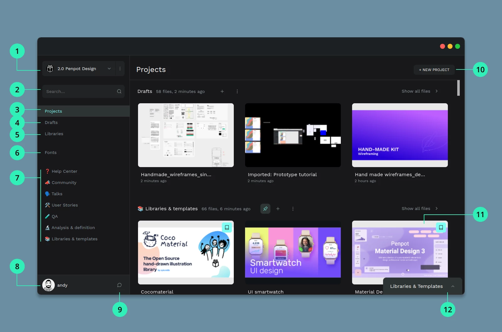1) Teams 2) Search files 3) Projects 4) Drafts 5) Shared Libraries 6) Custom fonts 7) Pinned projects 8) User area 9) Comment notifications 10) Create project 11) File card 12) Libraries & Templates module