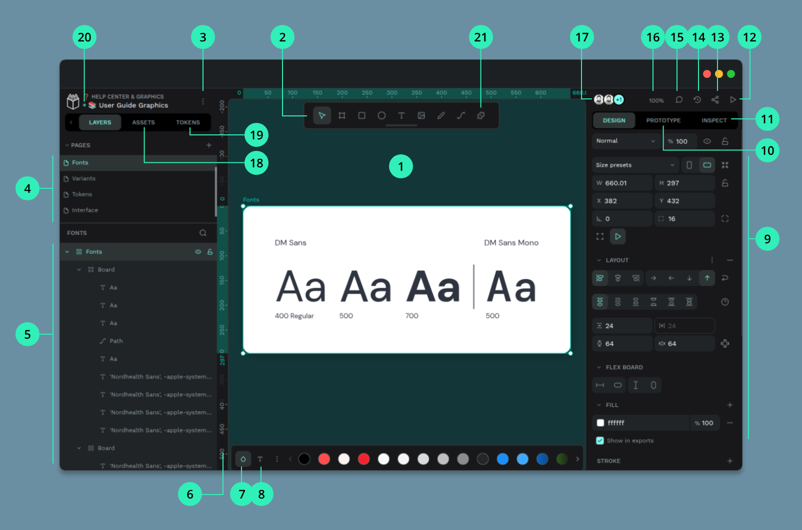 1) Viewport 2) Toolbar 3) Main menu 4) Pages 5) Layers 6) Rulers 7) Color palette 8) Typography palette 9) Design properties 10) Prototype mode 11) Inspect mode 12) View mode 13) Share / Invite 14) History 15) Comments 16) Zoom 17) Users 18) Assets 19) Design tokens 20) File status